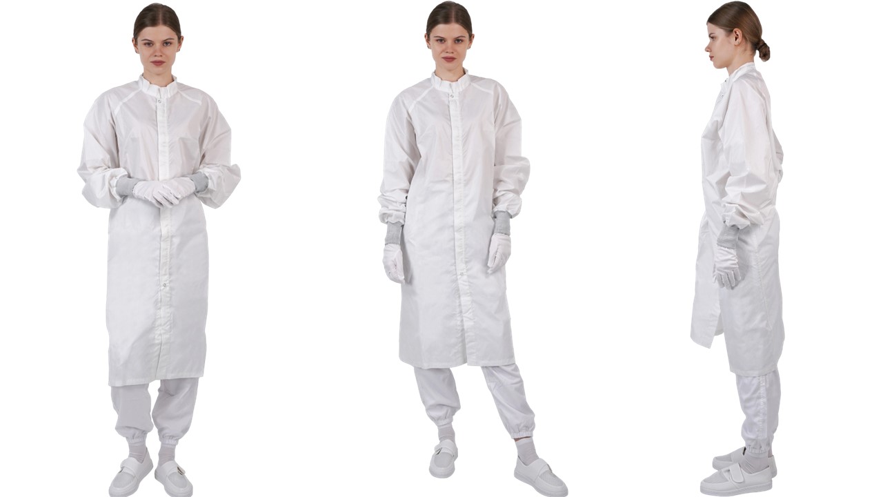 ESD対応の立ち襟ロングコート(膝下丈) クリーンルーム用ワークウェア