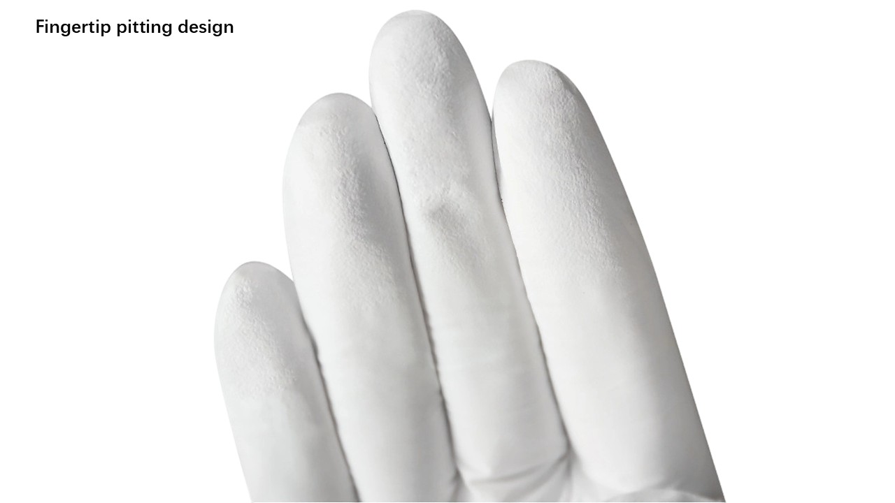 機能帯電防止仕様で、指紋が付きにくく、指先には滑り止めのエンボス加工が施されています、 酸・アルカリに強く、穿刺にも耐性があります